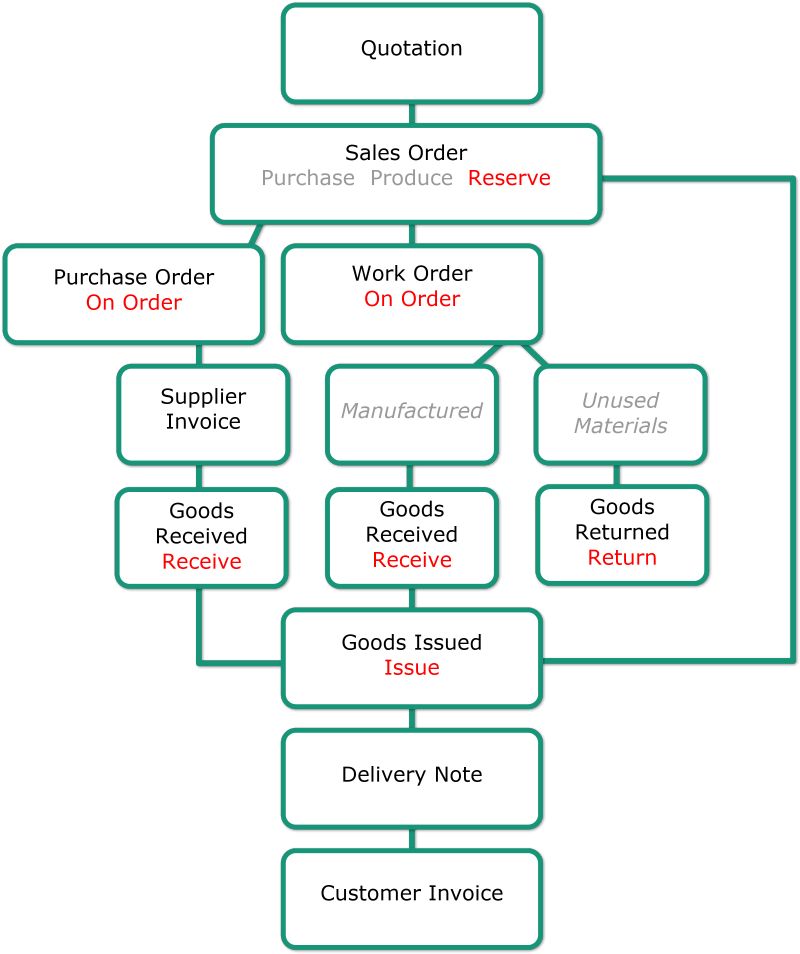 - Issue: The inventory is issued to a job or customer (e.g. Work Orders, Sales Orders, Customer Invoices).