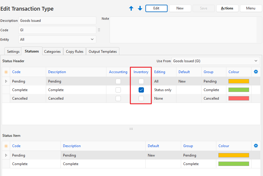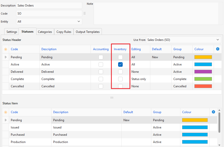 - The Inventory column for Statuses determine if the transaction must be considered when calculating inventory.