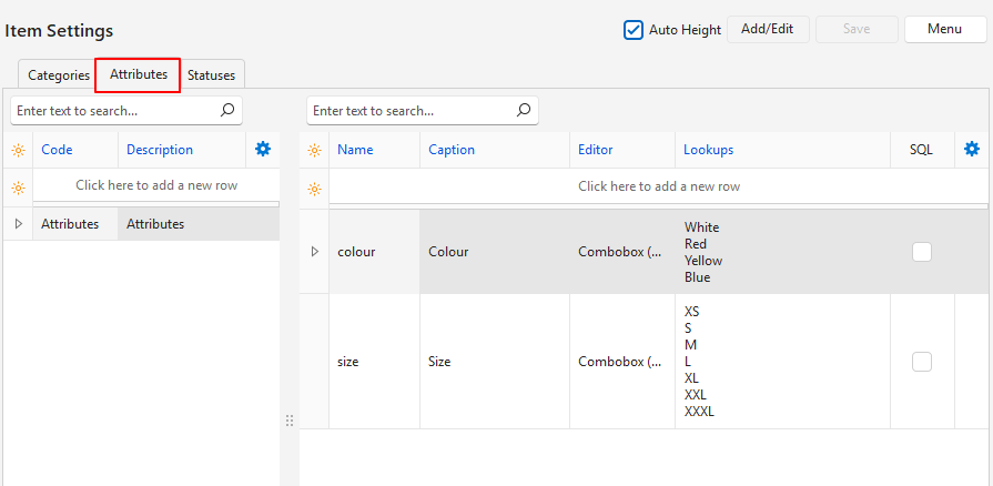 | Editor | A field to select an attribute option from this list: – Text: Accepts any text. – Number (0 Decimals): Accepts an integer. – Number (2 Decimals): Accepts a number with two decimals. – Number (4 Decimals): Accepts a number with four decimals. – Combobox (Fixed): An item must be selected from the lookup list. – Combobox (Edit): An item may be selected or manually entered (items typed in are not added to the lookup list). – Lookup SQL: Users can write an SQL query to create a lookup list. Right-click the entry and select View/Edit Lookup SQL from the context menu. |