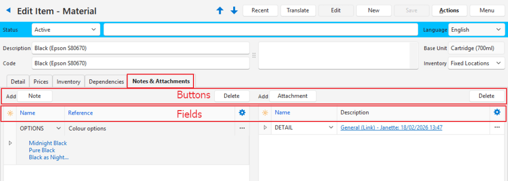 | Status Bar | Status: Sets the item’s status. Defaults to the status selected for new items. Only items with an Active status can be used in transactions. Description or Note: An additional field to type a detailed description or note. Language: The current language. By default, items are created in English. |