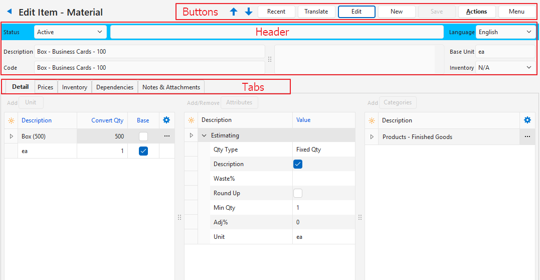 - The Units, Prices, and Inventory can only be maintained on the Base (English) version of the Item. When an Item is translated, these tabs are hidden.