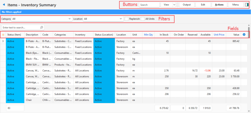 | Actions | Batch Update: Batch updates override the limitations of Variations in Edit View (i.e. that categories cannot be added or removed). The options are: – Category: Adds or removes the Category selected from the dropdown list. – Customer: Adds the customer selected from the dropdown list to the item’s header. – Inventory: Sets the inventory options for transactions selected from the dropdown list. The options are N/A, Fixed Locations, All Locations. If Fixed Locations are selected, an additional dropdown list allows users to select a location to add or remove. – Status: Changes the Status to the one selected from the dropdown list. Rebuild Inventory Report: Rebuilds the inventory report. This function should be run if units or costing unit items are changed. |