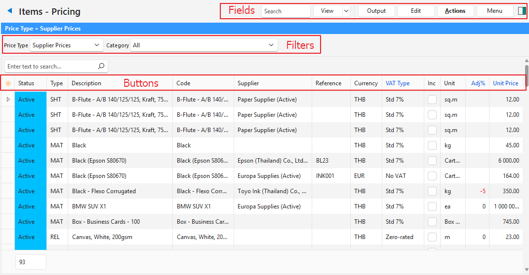 | Actions | Batch Update: Updates all the selected records (Use Ctrl + Left click to multi-select) when Update (button) is clicked. The available options depend on which price is selected. For example: – VAT Type: Changes the VAT Type to the one selected. – Adj%: Changes the Adjustment Percentage to the percentage typed in the adjacent block. – Fixed Price: Changes the Fixed Price to the price typed in the adjacent block. – Unit Price: Changes the Unit Price to the price typed in the adjacent block. – Price From: Changes the source of the cost price. Only available if Cost or Sell Prices are selected. – VAT: Changes the VAT Type to the one selected and whether the price includes or excludes VAT (Sell Prices only). – Price (Amount): Changes the price to the amount typed in the adjacent block (Sell Prices only). Clears the Price From field. – Price (GM%): Change the Gross Margin percentage to the percentage typed in the adjacent block (Sell Prices only). Clears the Price From field. |
