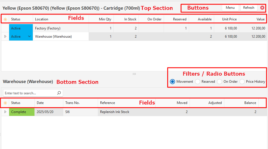 The top section shows a summary of the stock on hand, and related transactions. There is an entry for every location. If there is no stock on hand, there are no entries.