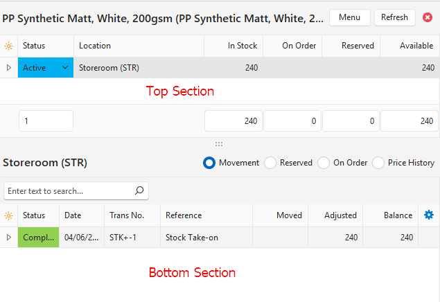 The top section shows a summary of the stock on hand, and related transactions. There is an entry for every location. If there is no stock on hand, there are no entries.