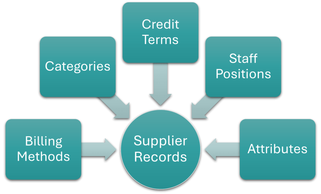 | Custom Attributes | Custom Attributes can be created to capture bespoke information on supplier records. Custom Attributes: Step-by-step instructions for creating custom attributes and adding them to supplier records (contacts). |