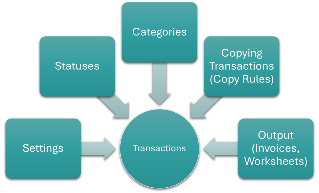 | Transaction Types | Transaction Types create the rules and environment for capturing transactions (e.g. which accounts can be debited or credited, how VAT is treated, and which of the additional features (e.g. calendars, estimating) are available. Transaction Types List View: Explains the fields, buttons, and additional features available when displaying a list of Transaction Types. Transaction Types Edit View: Explains the fields, buttons, and additional features available when creating or editing Transaction Types. Transaction Type Tutorials: Step-by-step instructions for creating Transaction Types. Each tab (1 – 5) is explained in detail below: 1. Transaction Type Settings: Part of creating Transaction Types. Explains the available settings, when to apply them and how to add them. Estimating is permitted on a transaction if the setting Estimating > Enable Estimating is added and Quotations is selected as the setting. 1a. Followers: Part of Transaction Type settings. Followers are the email recipients that receive the Output (e.g. Quotes, Invoices). Provides step-by-step instructions on using the followers’ feature. 2. Copying Transactions (Copy Rules): Part of creating Transaction Types. Explains the rules that determine when a transaction can be copied to create a new transaction (e.g. Quotation to Customer Invoice). Also explains how to set up the manual or automated copying of transactions. 2a. Linking Transactions: Part of Copying Transactions. Background information on what a transaction flow is and how it is created. 3. Transaction Type Statuses Interface and Tutorials: Part of creating Transaction Types. Explains how to create and edit statuses, including rules such as when a transaction can be edited, is posted to the ledger, or affects inventory. 4. Transaction Categories Interface and Tutorials: Part of creating Transaction Types. Allows transactions to be grouped to extract analytical data from it. Explains the fields, buttons and provides step-by-step instructions for creating and editing categories. 5. Transaction Types Output Tab: Part of creating Transaction Types. Output refers to the forms or documents that are created from the transaction (e.g. Quotation, Invoice, Worksheet). Explains how to link Output to the transaction type and the related settings. |