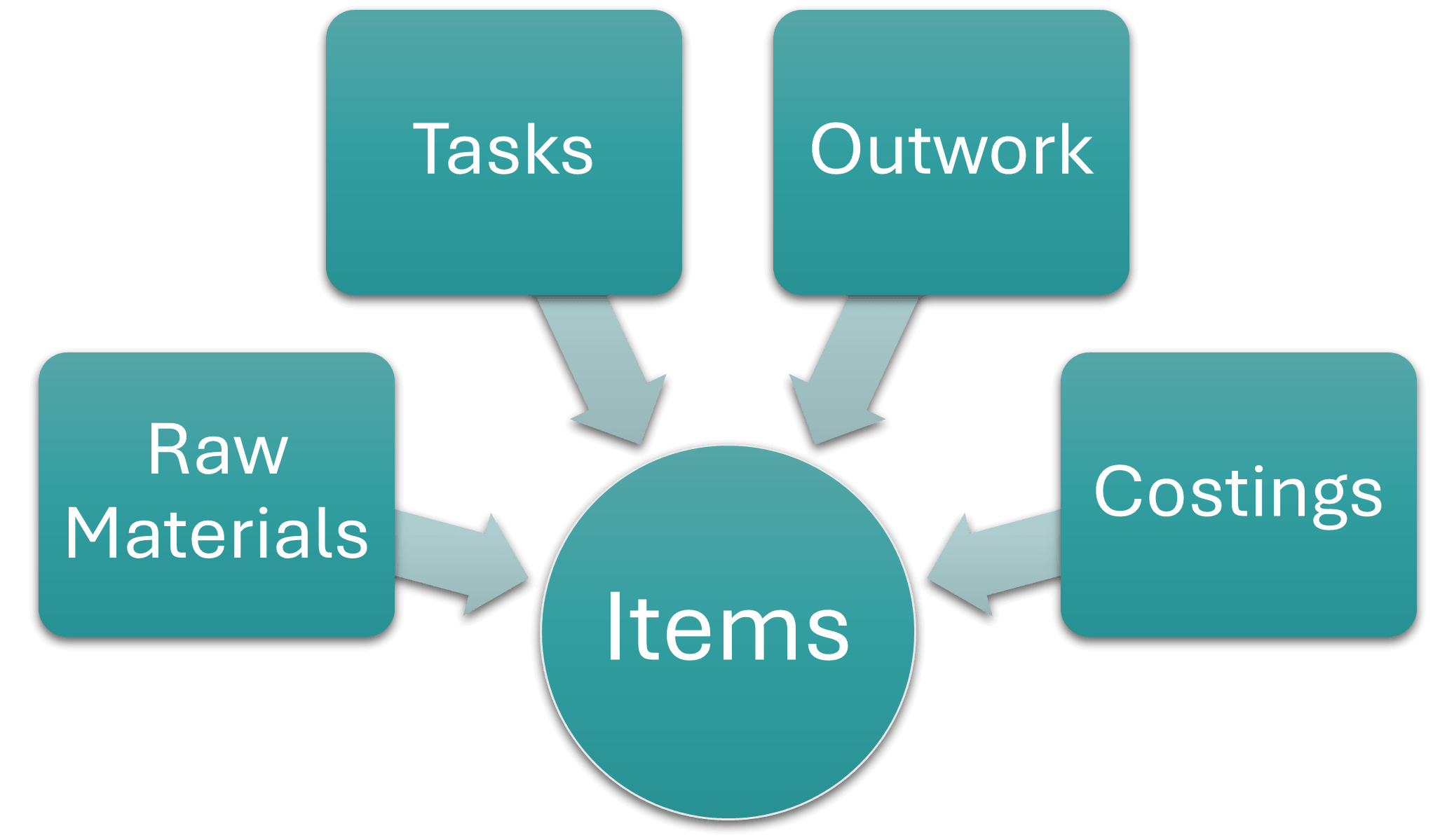 | Items | Items are the raw materials and finished goods used in production. Items can also consist of assemblies and costings (e.g. Item: Paper + Item: Ink + Task: Design + Task: Print = Item Finished Good: Brochure). Item Extension Types: Explains the types of items that are available. Item Prices Explained: Explains the various prices and how they are calculated and applied to transactions. Item Categories: Explains the fields, buttons, and available features for creating or editing categories and provides step-by-step instructions for creating and editing these categories. Item Creation and Editing Interface: Explains the fields, buttons, and available features for creating or editing items. Item Creation and Editing Tutorials: Step-by-step instructions for creating and editing items and using the available features. Item Attributes: Attributes are additional information that is added to items. These can be fixed sets that are used for estimating or custom sets. This article explains the fields, buttons, and available features for creating or editing attributes. Lists all the available attributes. Provides step-by-step instructions for adding attributes to items. Item List Views Interface: Explains the fields, buttons, and available features for viewing item lists. Item List Views Tutorials: Step-by-step instructions for viewing item lists and using the available features. Item Summary: Explains the item summary sections, fields, buttons and available functions. Provides step-by-step instructions for using the functions. Item: Print Costing Example: An example of an item with a costing that is used for a print project. |