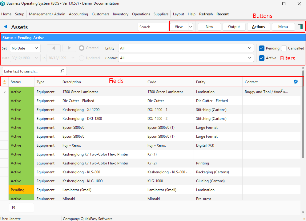 - Captions for the columns. Column headings can be right clicked to display a context menu. Some reports have blue captions to indicate the fields may be edited. In this case there will also be an Edit button on the top row of buttons that toggles editing mode.