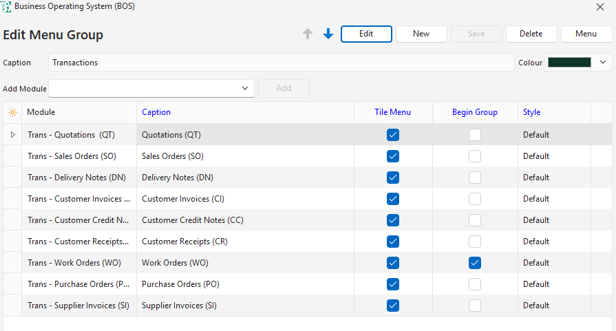 When Modules or Transaction Types are added to BOS, they must also be added to a Menu Group before users can access them.