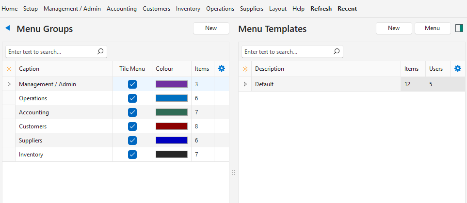 - Menu Templates are allocated to staff members. For example, a staff member who only captures supplier invoices and debit notes could be allocated a Menu Template that only contains those two transaction types, and the Fixed Menu Items.