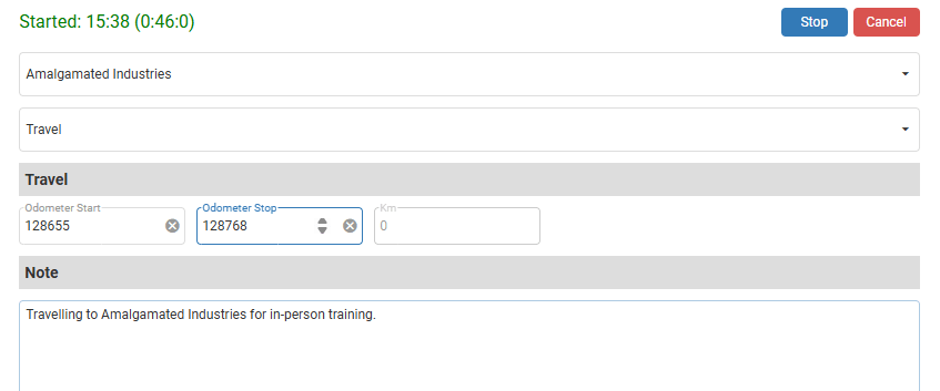 Travel – Odometer Start – Odometer Stop – Km | Fields to enter the start and stop odometer readings. Either the stop odometer or the distance travelled can be entered (the other field are auto filled). Only applicable if Travel timekeeping record was started. These fields are not displayed if a Work timekeeping record was started. |