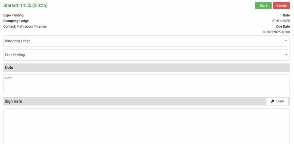 Start Signature (Sign Here) | A field for a Start Signature is displayed. A customer or supervisor can sign the device using their finger or a stylus. The signature is captured as an image and saved with the timekeeping record. Only applicable to Work timekeeping records, not travel. |
