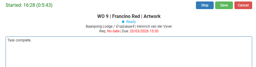 | Save (button) | Edit Timekeeping: Saves the changes. Stop Timekeeping: Saves any changes made to the timekeeping record without stopping it. |