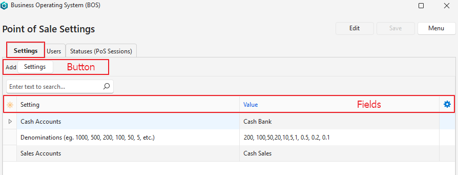 | Setting | The name of the setting. There are three settings, and their defaults values are blank: – Point of Sale (PoS) > Cash Accounts: Provides a list of accounts. The bank accounts used for cash should be selected. – Point of Sale (PoS) > Denominations: Allows the currency denominations to be entered. Denominations below 1 (i.e. coins) should be entered as decimals. – Point of Sale (PoS) > Sales Accounts: Provides a list of accounts. The account/s used for cash sales should be selected. The value of transactions posted to these accounts are shown on the dashboard. If only one sales account is used for cash and credit sales, it should be selected here: The system will isolate the sales captured through PoS. |
