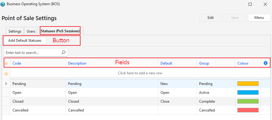 | Colour | The colour of the status. The colour can be changed by clicking the field to display an arrow, clicking the arrow, and selecting a different colour. |