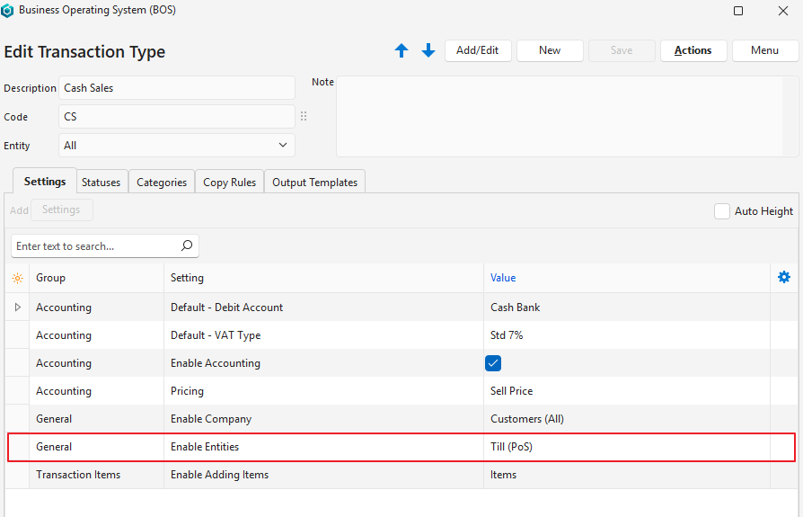 - General > Enable Entities and select Till (PoS) in the Value column.