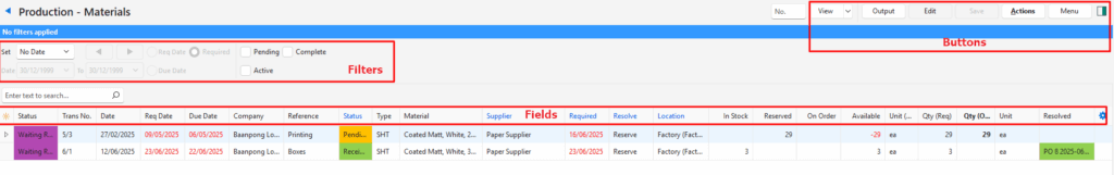 Actions | Allows for changes to be made to multiple records that can be selected using Ctrl + Left Click. The options are: Batch Update: Changes all the selected records when Update (button) is clicked. The options are: – Location: Sets the location to the one selected from the dropdown list. – Required: Sets the required date (for the materials) to the one selected on the calendar. – Resolve: Sets the resolve option to the one selected from the dropdown list. The options are Purchase or Reserve. – Status: Sets the status of the Item to the one selected from the dropdown list. – Supplier: Sets the supplier to the one selected from the dropdown list. Copy to Purchase Orders: Materials: Creates a Purchase Order. (Text may vary. It is the copy command created under Copy Rules.) Multiple records may be selected. Copy to Goods Issued: Creates a Goods Issued. (Text may vary. It is the copy command created under Copy Rules.) Multiple records may be selected. |