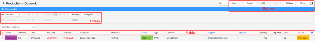 Actions | Allows for changes to be made to multiple records that can be selected using Ctrl + Left Click. The options are: Batch Update: Changes all the selected records when Update (button) is clicked. The options are: – Status: Changes the status of the outwork item to the one selected on the dropdown list. – Supplier: Changes the supplier to the one selected on the dropdown list. – Required: Changes the required date to the one selected on the dropdown list. – Copy to Purchase Orders: Outwork: Creates a Purchase Order. (Text many vary. It is the copy command created under Copy Rules.) Multiple items can be selected in which case purchase orders are created per supplier. |