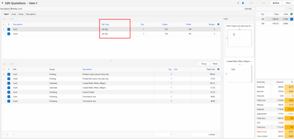 It is vital that the correct Quantity Type is chosen for Costings and Estimates.