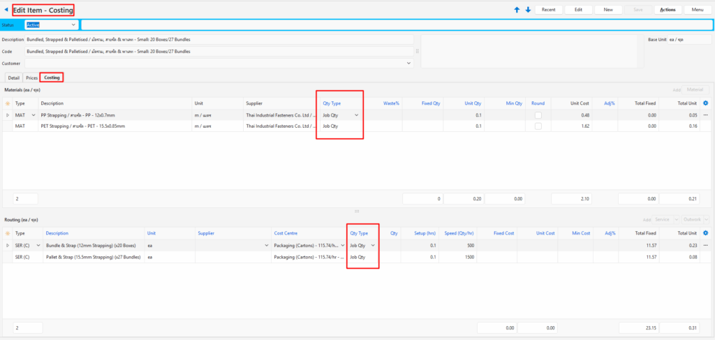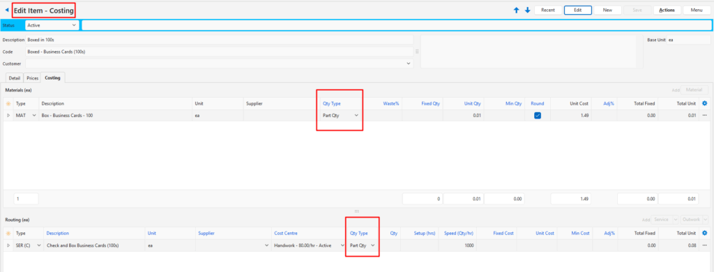 Part Qty | The Costing Quantity is multiplied by the Part and Job Quantities. This Quantity Type sums all the Part Quantities if it is used on a Service or Material that is not linked to a Part. |