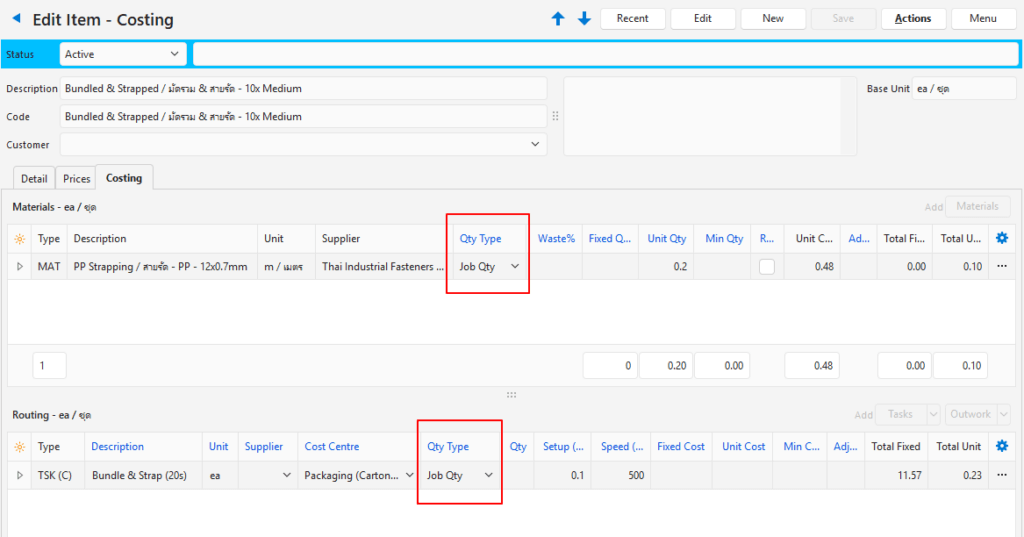 | Job Qty | The Costing Quantity is Fixed, regardless of the Job, Estimate, or Part Quantities. The Quantity (Qty) is multiplied by the Unit Quantity (Unit Qty). Any Quantity in the Fixed Qty field is added to the Quantity to determine the Total Quantity. If the Total Quantity is less than the Minimum Quantity, it is replaced with the Minimum Quantity. |