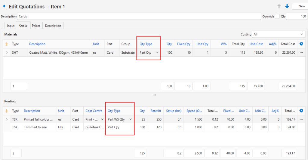 | Part Area (sq.m) | The Costing Quantity is multiplied by the Job Quantity, Part Quantity, and the Part Area Square Metre. It is used for items such as ink that covers a specific area. Calculation = Part Area + Margin x Part Qty (depends on Part Qty Type). |