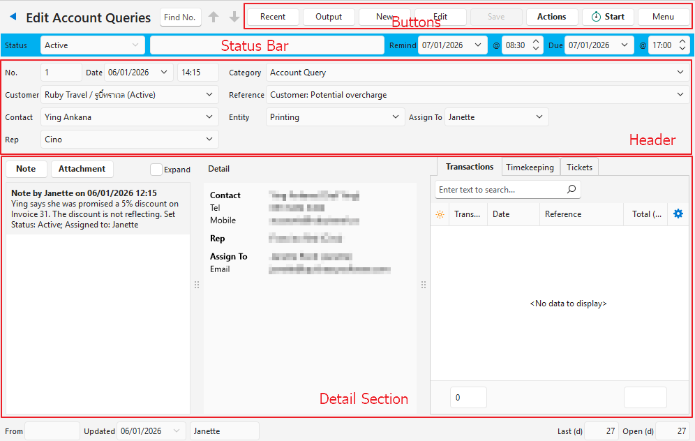 | Detail (tab) | Displays Contact details for the contact, rep, and user the ticket is assigned to. Displays Asset Attributes for assets linked to the ticket. Customising the detail tab is a service that QuickEasy offers. |