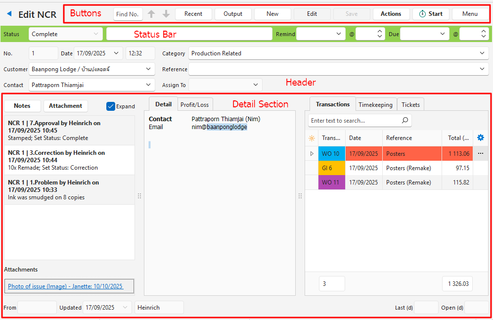 Actions | Allows for changes to be made to multiple records that can be selected using Ctrl + Left Click. The options are: Refresh Copy to New Ticket: Copies the ticket to create a new ticket. (Only appears if Copy Rules have been created). Delete Ticket: Deletes the ticket. Filter: Filters the entries on the three tabs on the Detail tab (Transactions, Timekeeping, Tickets). Only the filters enabled by the service type are displayed. – Ticket – Asset – Company Contact – Add Customer – Edit Customer – Edit Contact Create Transaction: Option to create a transaction based on the ticket’s information (e.g. Quotations). |