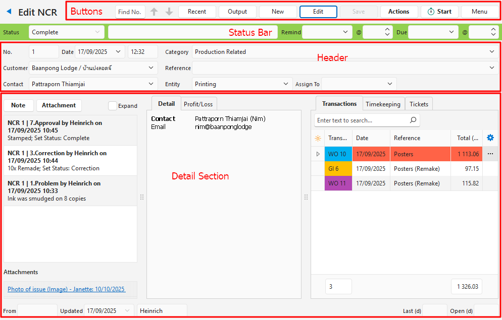 | Detail (tab) | Displays Contact details for the contact, rep, and user the ticket is assigned to. Displays Asset Attributes for assets linked to the ticket. Customising the detail tab is a service that QuickEasy offers. |