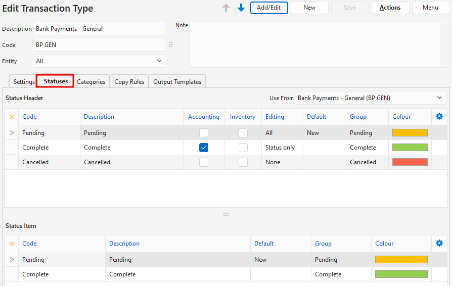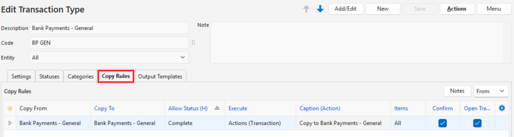 - Categories can be copied from another transaction type. The existing categories are replaced by the copied categories.