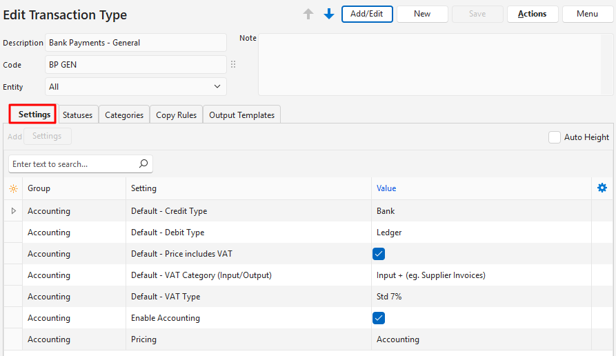This page provides an example of a Transaction Type setup for Bank Payments (General).