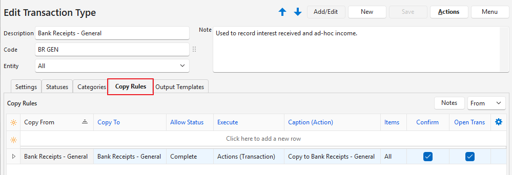 - Categories can be copied from another transaction type. The existing categories are replaced by the copied categories.