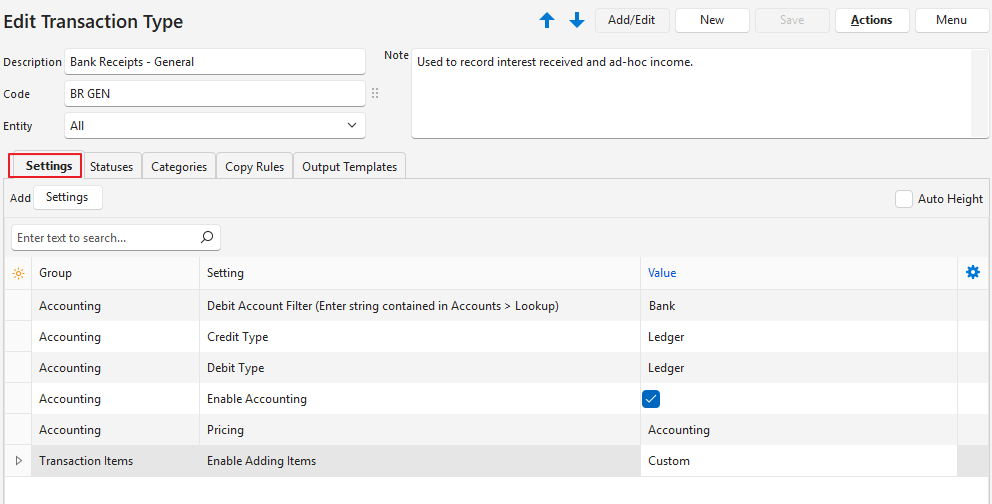| Transaction Items > Enable Adding Items | Allows users to specify which type of items can be added to a transaction. The options are: – None: No items are added, only the header information is displayed. This option should be used sparingly and not for accounting transactions because there will be no fields for amounts. – All: Users may add items and custom items. – Custom: Users my only add custom items. Typically used for ledger transactions. – Items: Users may only add items. They may not add custom items. Typically used for Invoicing, credit and debit notes. All the buttons to add items are still displayed. The features that are disabled return an error message if clicked. | Custom | Always |