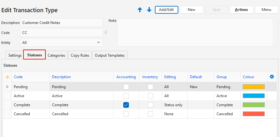 | Transaction Items > Enable Adding Items | Allows users to specify which type of items can be added to a transaction. The options are: – None: No items are added, only the header information is displayed. This option should be used sparingly and not for accounting transactions because there will be no fields for amounts. – All: Users may add items and custom items. – Custom: Users my only add custom items. Typically used for ledger transactions. – Items: Users may only add items. They may not add custom items. Typically used for Invoicing, credit and debit notes. All the buttons to add items are still displayed. The features that are disabled return an error message if clicked. | Select All, Custom, or Items. | If you create credit notes manually (as opposed to copying them from invoices), you can add the setting to limit the items that can be added to a credit note. |