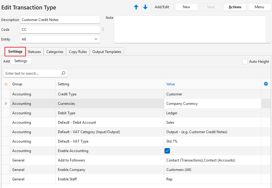 This page provides an example of a Transaction Type setup for Customer Credit Notes