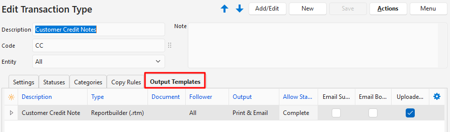 - Output templates are the forms you need to print, preview or email a transaction (e.g. invoices).