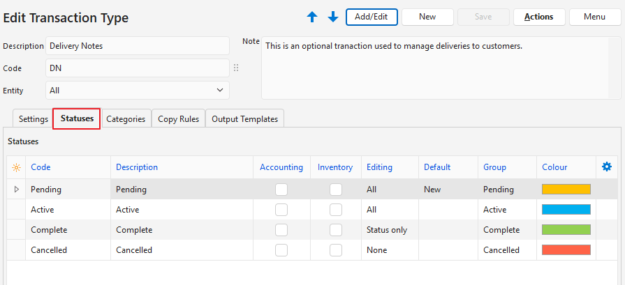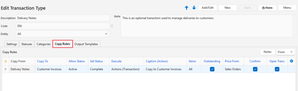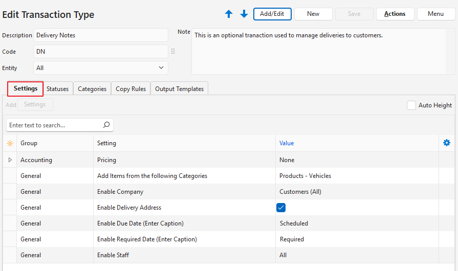 This page provides an example of a Transaction Type setup for Delivery Notes.