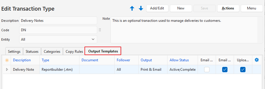 - Output templates are the forms you need to print, preview or email a transaction (e.g. invoices).