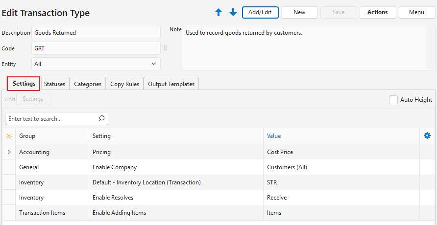 This page provides an example of a Transaction Type setup for Goods Returned (transactions).