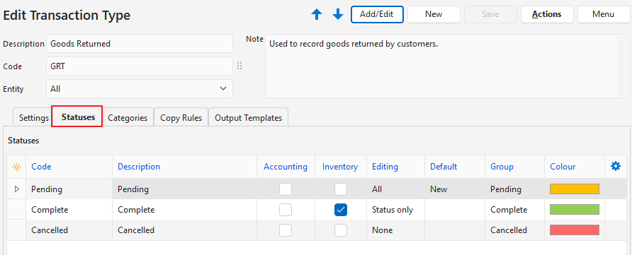 - If Inventory is used, at least one status should have the Inventory column checked.