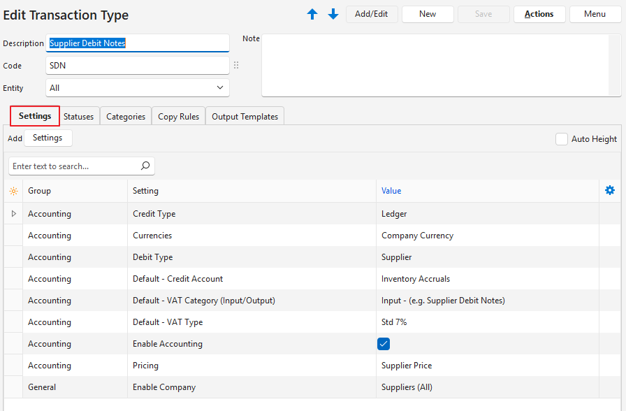 | General > Transaction Number | Specifies how transaction numbers are allocated when the transaction type is first created. The options are: – Edit: Allows users to edit/enter numbers only (e.g. for supplier invoices). A warning is displayed on the red warning bar if a duplicate transaction number is entered. – Generate: The system automatically generates numbers in sequence. – Generate (Entity): The system automatically generates numbers in sequence for each entity. This setting cannot be changed if there are transactions. | Edit | If you want to type the supplier debit note number in the document number field. |