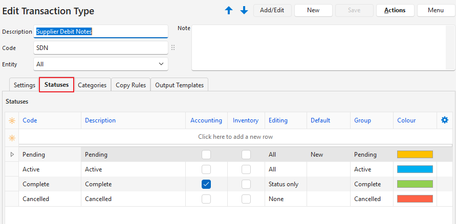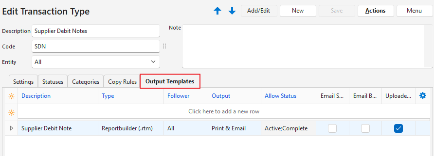 This page provides an example of a Transaction Type setup for Supplier Debit Notes.