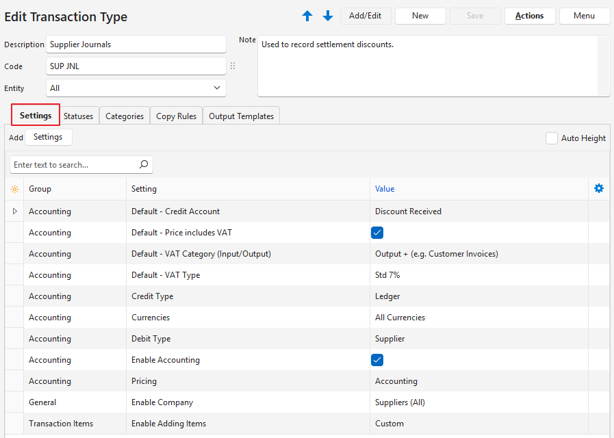 This page provides an example of a Transaction Type setup for Supplier Journals.