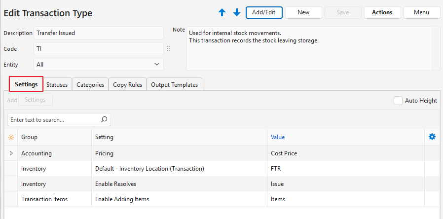| Transaction Items > Enable Adding Items | Allows users to specify which type of items can be added to a transaction. The options are: – None: No items are added, only the header information is displayed. This option should be used sparingly and not for accounting transactions because there will be no fields for amounts. – All: Users may add items and custom items. – Custom: Users my only add custom items. Typically used for ledger transactions. – Items: Users may only add items. They may not add custom items. Typically used for Invoicing, credit and debit notes. All the buttons to add items are still displayed. The features that are disabled return an error message if clicked. | Items | Always (Custom items are not tracked as inventory items.) |