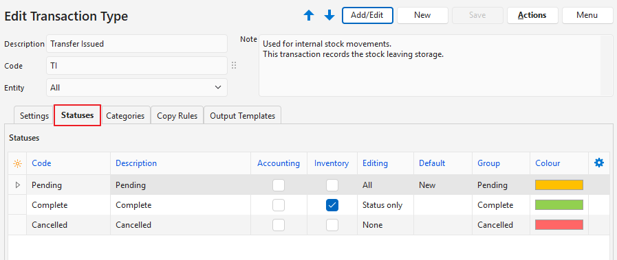 - If Inventory is used, at least one status should have the Inventory column checked.