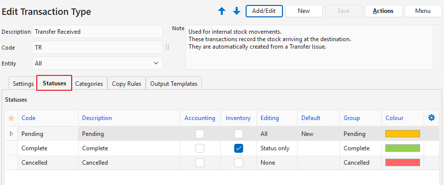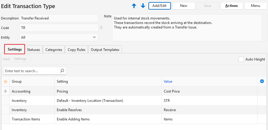 | Inventory > Enable Resolves | Allows users to specify what must happen to inventory items. The options are: – Purchase: The inventory must be purchased. This resolve is used for copying transactions and does not affect inventory. – Produce: The inventory must be produced. This resolve is used for copying transactions and does not affect inventory. (e.g. Work Orders). – Reserve: The inventory is reserved for an order (e.g. Sales Orders). – Issue: The inventory is issued to a job or customer (e.g. Work Orders, Sales Orders, Customer Invoices). – On Order: The inventory has been ordered, but not yet received (e.g. Purchase Orders, Work Orders). – Receive: The inventory has been received (e.g. Supplier Invoices, Work Orders). – Adjust: The inventory is adjusted to reflect the correct stock on hand (e.g. Stock Take Adjustments). | Received | Always |