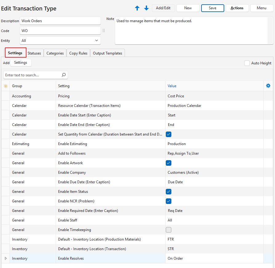 | Estimating > Enable Estimating | A dropdown list with the following options: – None: Estimating is not used. – Quotations: Estimating is used to quote for jobs. – Production: Enables the production planning modules for the transaction type. | Production | Always |
