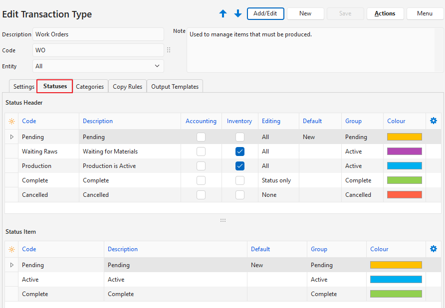- However, there are only four Status Groups (Pending, Active, Complete, and Cancelled).