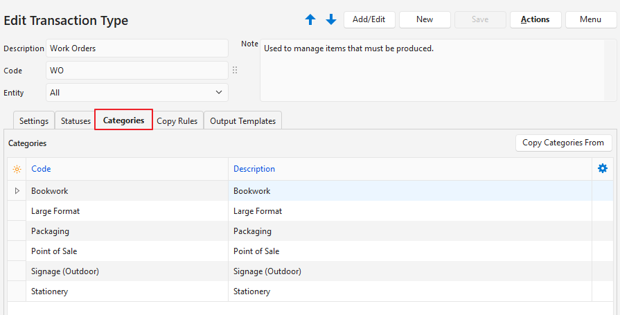 - Categories can be copied from another transaction type. The existing categories are replaced by the copied categories.
